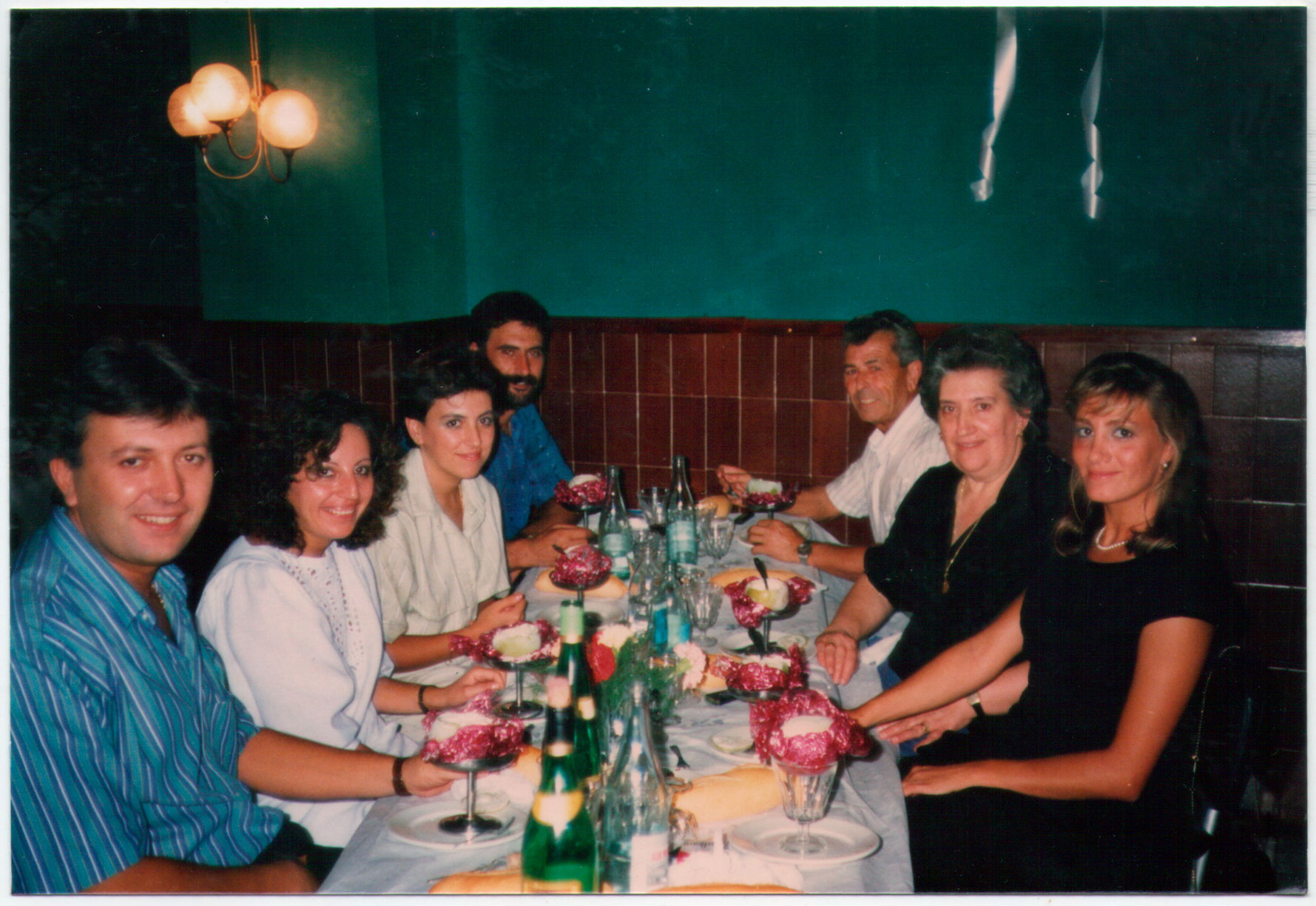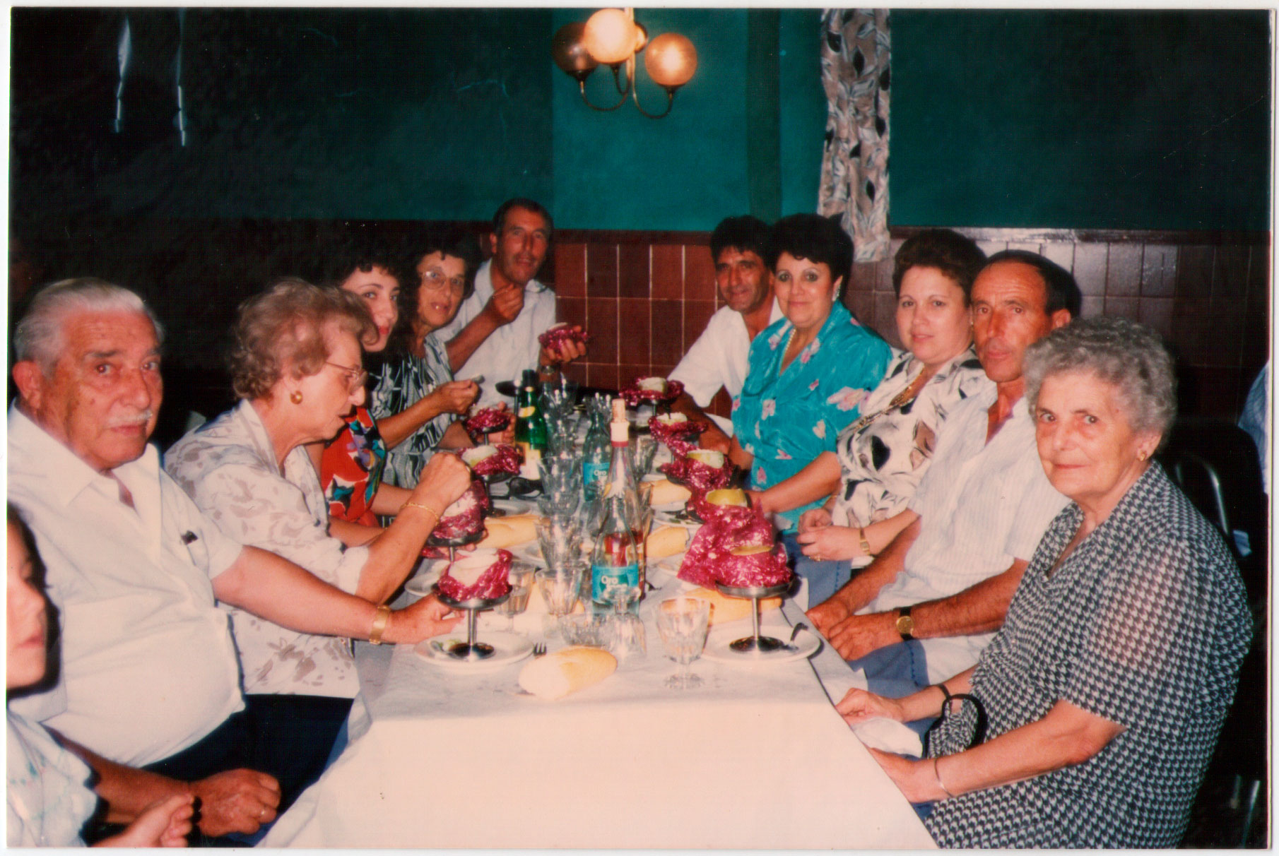 44- Les fotos de la boda anterior contrasten amb les d’este altre àpat luxós. Ara l’espai és asèptic i molt decorat, el menjar és més sofisticat (fixeu-vos en la presentació del postre), veuen vins de certa categoria i aigua embotellada. Els comensals són sobradament coneguts, es tracta de la família de Vicent el Cartero i Carmen de Vedrí: Vicent el Cartero fill i la seua dona Lolita; Carmen i el seu marit, Juanito Meto; i a esta altra vora Vicent, Carmen i Matilde la dona de Francisco Caranyo, propietari d’esta col·lecció de fotos, que estaria fotografiant al grup.