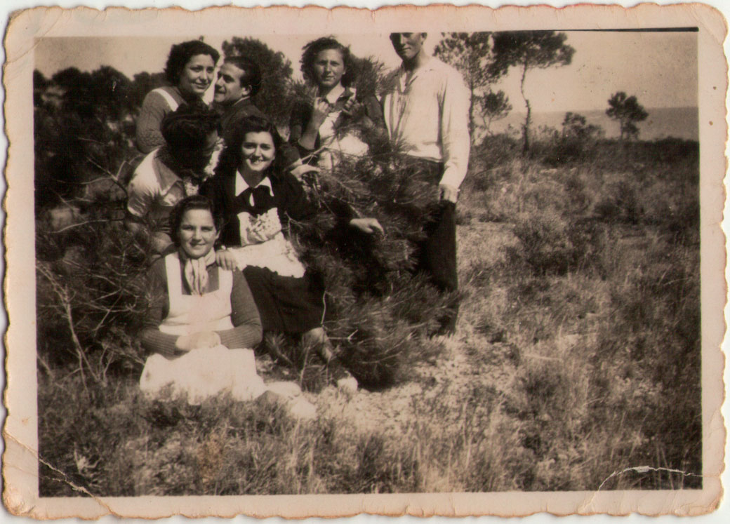 21- Es coneix que els joves eren aficionats a les excursions. Ací estan les xiques, carregades de davantals, molt comboiades per xics; només coneixem, de nou, a Teresa, i, a la dreta, amb el cap tallat, el que podria ser Vicentet de Menuda.