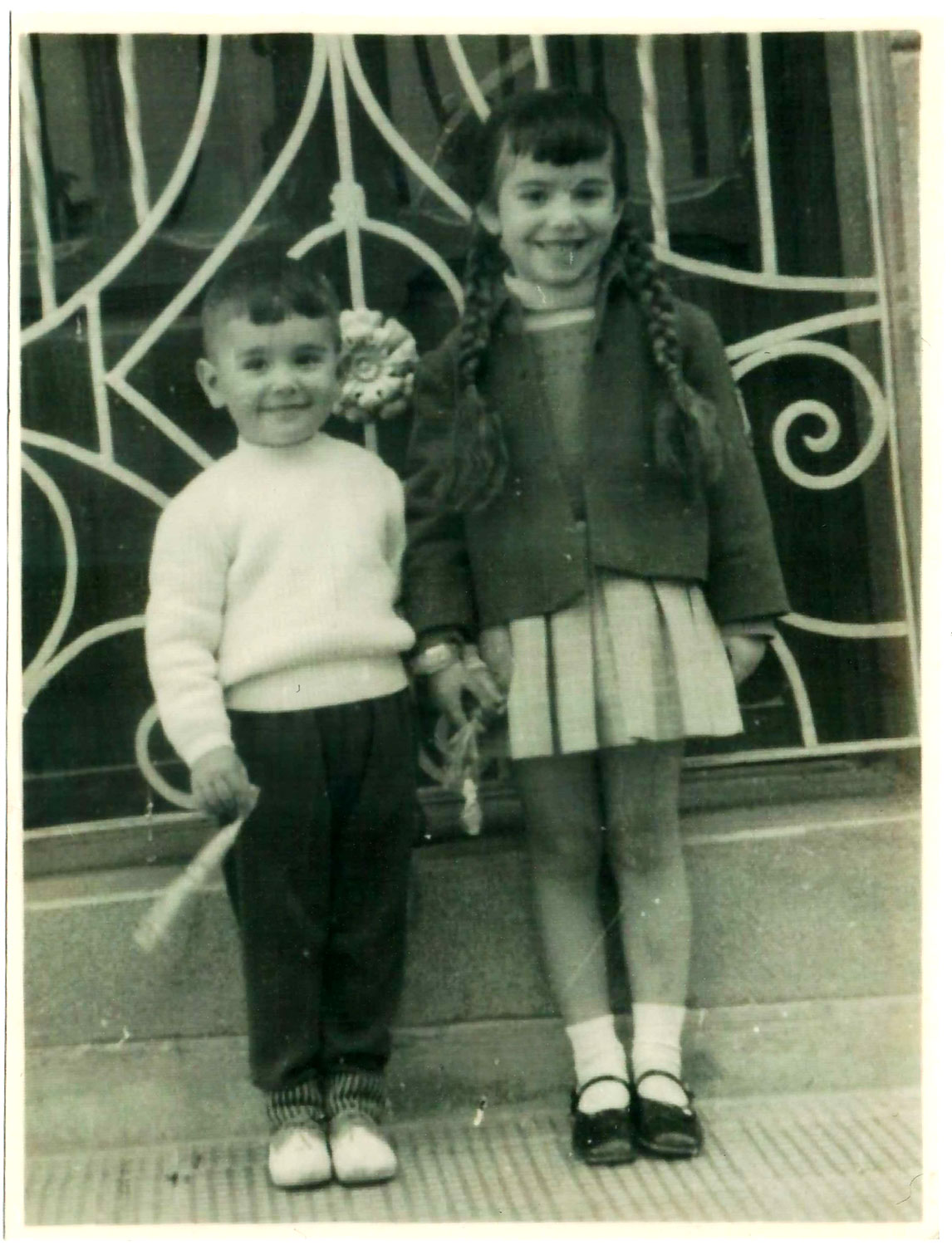 33- Francesc i la seua germana Mari Ángeles posant per a son pare en 1960 davant d’una bonica reixa de forja. Francesc pensa que estan davant de la casa familiar de la Foia (C/San salvador 11), ricament decorada a la moda modernista dels anys 20, però hem comprovat que la reixa és distinta (la que es veu és de forja i l’actual de fundició), potser perquè es canviara en algun moment. Tampoc no hem identificat quin tipus de joguet tenen a les mans, potser una flor artificial de roba.