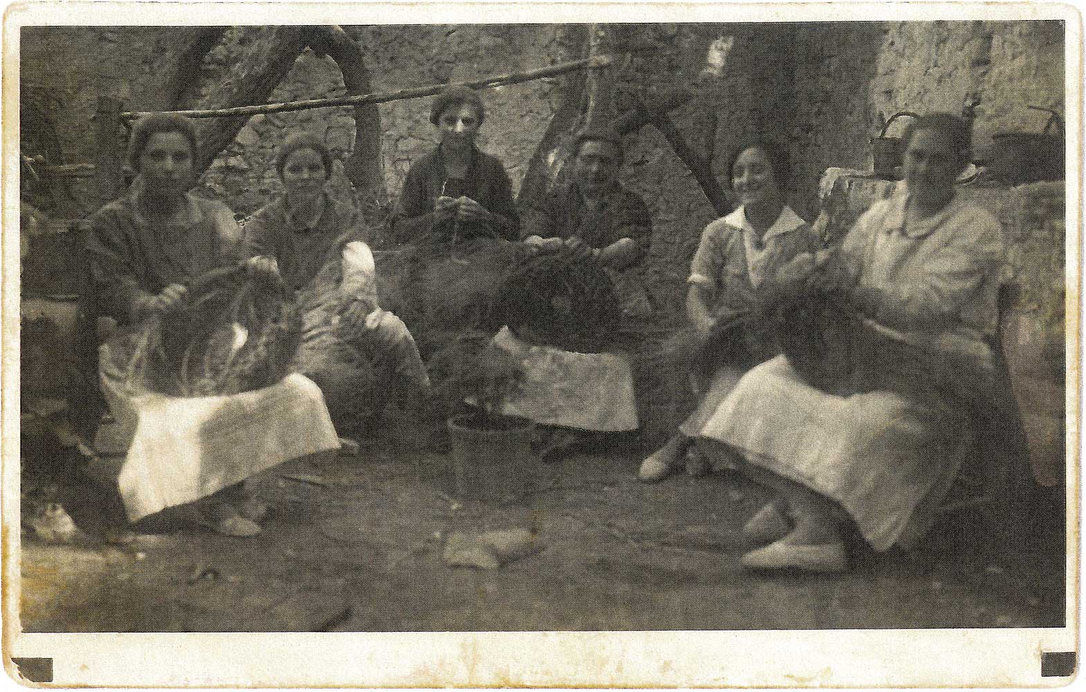 Esta és la foto original: les xiques estan en algun corral, fent espartí i segurament xarrant i cantant, distraient-se juntes. Com és sabut, esta forma de treballar, lliure i entre amigues, s’acabaria en el moment en què les van obligar a concentrar-se en els magatzems dels empresaris. Per a saber més sobre l’ofici i la indústria de l’espart, l’obra fonamental és el llibre de Josep Herrero Cabanyes, Dels sariers a la indústria de l’espart. Transformació i declivi de l’economia de l’espart a Artana, que es pot llegir a Artanapèdia.