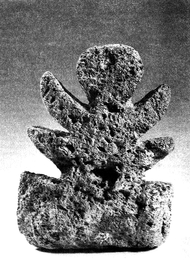 8. N. Mesado., L’ídol Eneolític d’ Artana (La Plana Baixa), edita Generalitat Valenciana 1997 (folleto): «Es tracta d’una obra autòctona. Sobre una base prismàtica que li serveix de basament s’erigeix una silueta formada per un cos, del qual naixen dos parells d’apèndixs simètrics, els braços, corbats amunt en actitud de prec o oració, que emmarquen una massa circular que es defineix clarament com el cap d’aquesta singular escultura […] L’Ídol té una altura de 52 cm i una amplada de 41 cm. Per això és 1′ obra mobiliar eneolítica de major grandària que fins ara s’ha trobat a la península ibérica». El Dr. F. Esteve sitúa el hallazgo de La Diosa-Ídolo en las cercanías de la Cova El Tinent, en la Serra. Ver F. Esteve, «L’Ídol d’Artana» en Commemoració del XXX Aniversari del Museu Arqueològic Comarcal de la Plana Baixa. Burriana (1967-1997). Castelló 2000, 85-87.