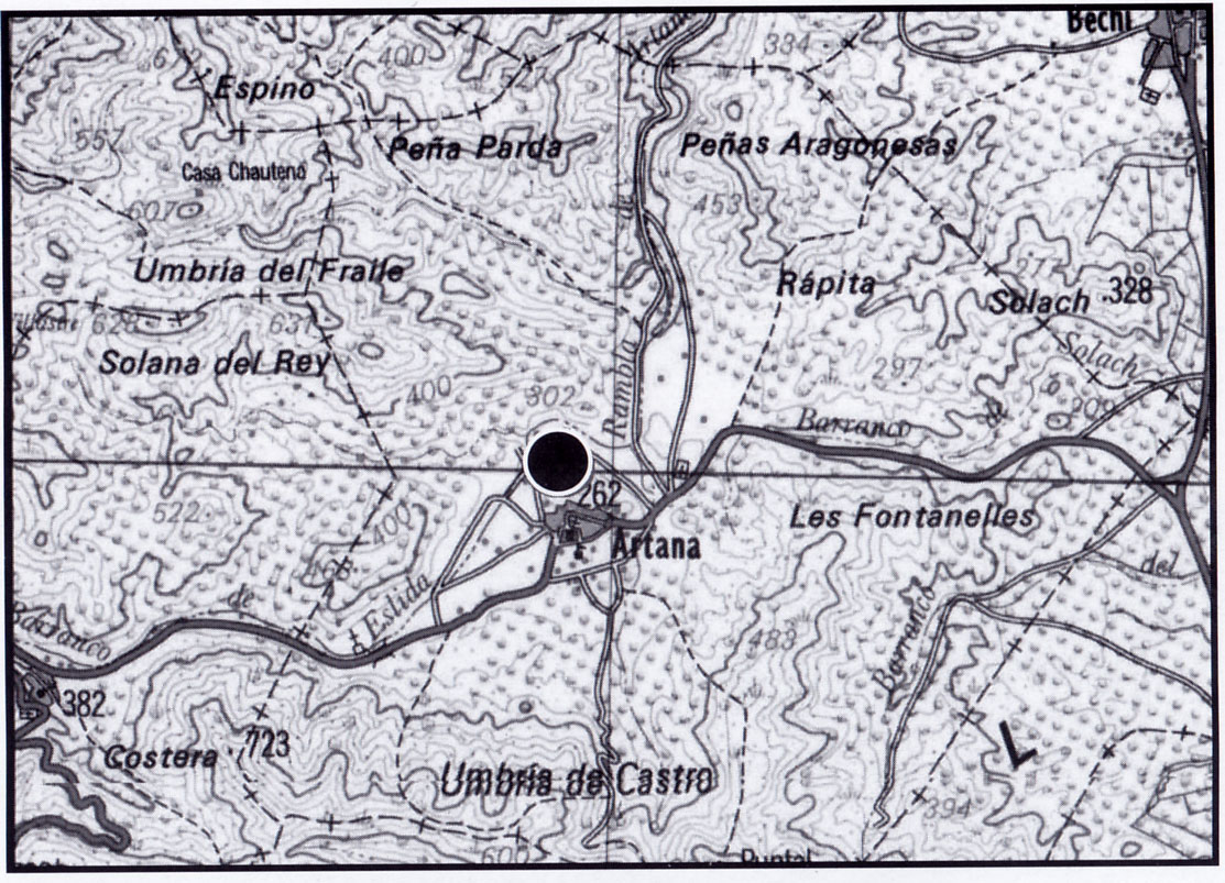 El Castell d’Artana se sitúa en un pequeño cerro localizado al N del municipio de Artana (Fig.4 y 5). Este cerro, de 341 m de altura s.n.m., queda delimitado al W y N por la Rambla de Artana, al S por el valle donde se sitúa dicha población y al E, algo más distanciado, por el curso del Barranc de Castro.