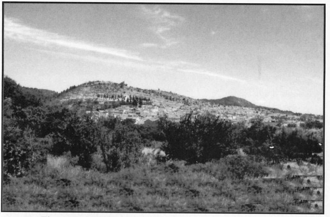 El tercer recinto diferenciado en el cerro del Castell está formado por una amplia terraza, situada al Norte del recinto superior y en una cota inferior, presidida por los muros y torres de éste (Fig. 28) y delimitado por un foso que discurre al N del castillo y prosigue por la ladera E del cerro (Fig. 29). Tampoco en esta superficie se han podido efectuar, por el momento, actuaciones arqueológicas, dado que hoy día aún tiene un uso agrícola.