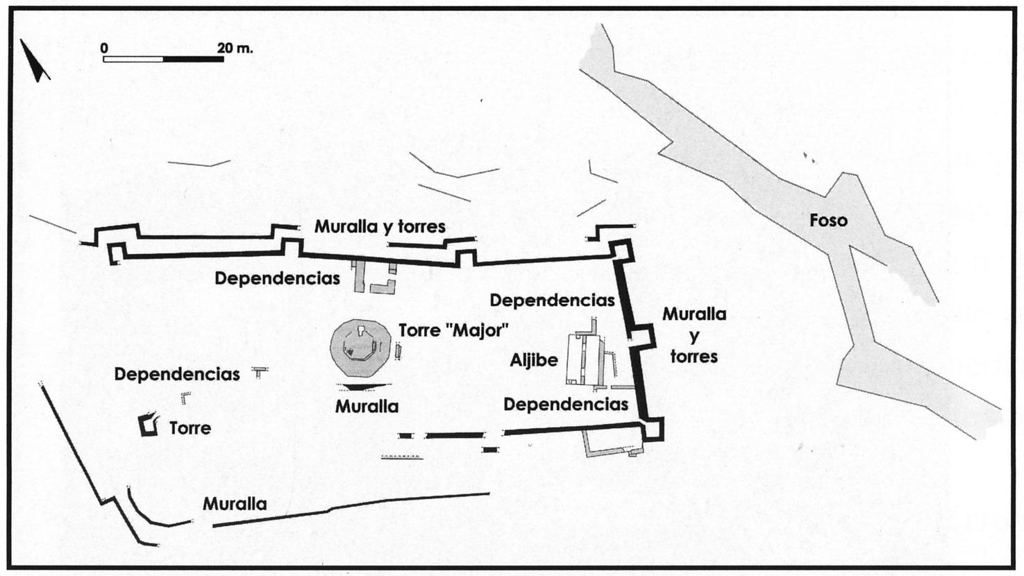 Creemos que sería durante el periodo musulmán cundo se construirían las líneas básicas de la fortaleza que hoy vemos o, al menos, parte del trazado que siguen los lienzos de muralla y torres que conforman el recinto superior (Fig. 30). No obstante, esta segunda fase de ocupación, hoy por hoy, constituye más una intuición basada en la presencia de ciertas técnicas constructivas observadas en la muralla, que esperan ser estudiadas en futuras intervenciones, que un hecho probado, ya que, lamentablemente, los restos cerámicos recuperados aportan poca información a la hora de aclarar la existencia o no de dicha ocupación. Sin embargo, la falta de material cerámico puede explicarse por otras causas, como, por ejemplo, el uso al que se destinó, en el periodo histórico mencionado, el recinto, el cual, no necesariamente tuvo que tener un carácter residencial, militar o de coerción como parece ser que adquiere en épocas posteriores (Fig. 31).