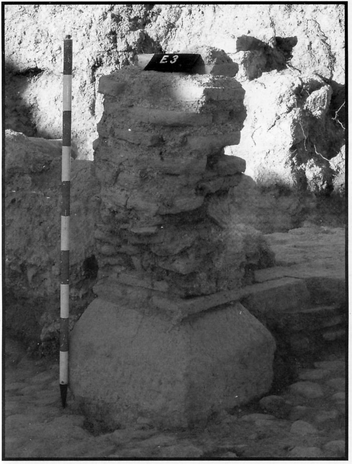 El espacio porticado y techado, con una anchura de 130/150 cm y delimitado por ocho columnas de planta octogonal, se distribuye en torno a la superficie abierta, envolviéndola (Fig. 20). Dichas columnas están confeccionadas con ladrillos de cantos biselados, alternados con capas de mortero de cal que, finalmente, se enlucen con una espesa, pero endeble, capa de mortero de tonalidad rosada (Fig. 21 y 22). De las ocho documentadas, tres de ellas conservan un alzado considerable, en torno al metro, destacando la columna E.3, situada en la zona central del ala oeste, que, a diferencia del resto, presenta una basa de sillería (Fig. 21).