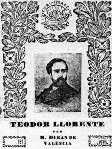 12.— «La història, la crítica, la revissió (sic) de valors, les noves joventuts, les modes literàries i artístiques que pretenguen, en nom d’una renovació literària —naturalment indispensable i útil— o en nom de qualsevol credo o tendència, girar-s’hi contra els Patriarques de la Renaixença i, amb ells, contra les altes valors espirituals que representen, minvar llur glòria, trobaran sempre al davant, armats de totes les armes de l’esperit, i també de la força, als que en aquesta lluita, no finida encara, per la completa victòria del nostre idioma, de les nostres lletres, de la nostra personalitat com a poble i de l’ànima que tot ho aguanta, havem posat alguna cosa més que la vanitat del nom reconegut i l’interés d’un guany material, immediat o llunyà: havem posat tot el que de bo i millor hi ha en nosaltres i el sacrifici generós per l’ideal». DURAN DE VALÈNCIA, Miquel, “El poeta Teodor Llorente, iniciador, a València, de la Renaixença de l’idioma i de les lletres”, dins La República de les Lletres, núm. 7, València, gener-març, 1936; pp. 3-4.