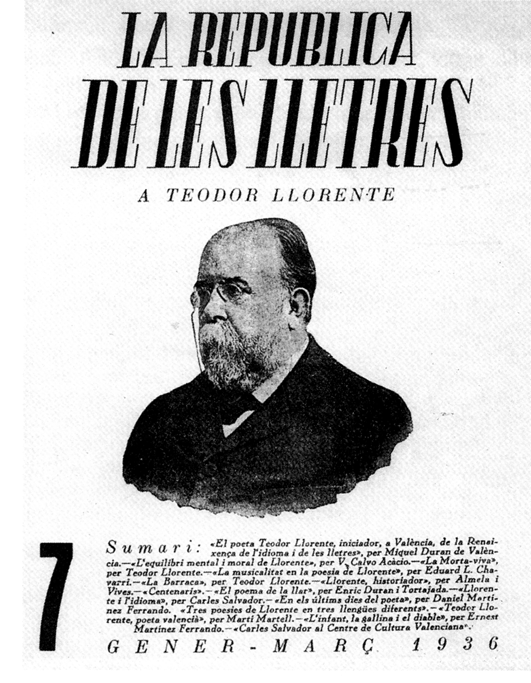 S’equivoca —i molt— Ricard Blasco quan afirma: «En 1936 es complien cent anys del naixement de Llorente i La República de les Lletres hi dedicà un número especial que confina definitivament el patriarca en l’armari de la historia»15. Res d’això pretenien els valencianistes de principis de segle. El que volien era homenatjar-lo i vigoritzar-lo, reivindicar-lo, efectivament, per a la història cultural de València, però en cap cas proscriure’l. D’haver estat així, ¿també se li haurien dedicat, a més, escrits i biografies —com ara la de Miquel Duran— igualment reivindicatives, o l’antologia poètica que en 1946 enllestí Carles Salvador amb la més significativa obra del qui, en paraules del mateix antologista, fou «figura primordial de la poesia moderna valenciana»16? En fer aqueixa cruel asseveració, amanida amb un comentari sarcàstic sobre l’actitud d’un joveníssim poeta, Xavier Casp, que —amb vint-i-un anys— es declarava nét de Teodor Llorente (“nostre incensari”, anomena Casp a Llorente en una aconseguida metàfora), Ricard Blasco demostra no haver entés gens ni mica l’actitud i la tasca d’uns escriptors que, d’altra banda, mereixen tot el seu respecte. Tots coneixem la trajectòria social de Xavier Casp, però això mateix que ell, un dels majors artífexs de la recuperació de la postguerra17, proclamava en 1936 ho manifestava el mateix any el també aleshores jove Enric Valor18, i ningú no se n’escandalitza. I és que en aquell moment la cosa no podia funcionar d’altra manera. El mestratge de Llorente, tan absorbent com hom vulga, hi feia correctament la seua cursa i, amb el temps, donava els seus millors fruits.