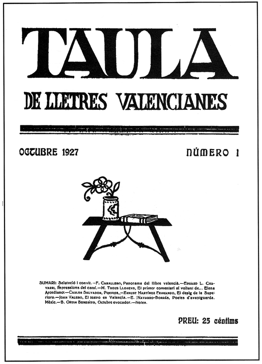Serà convenient, per a això, fer repàs d’alguns dels projectes més importants que veieren la llum durant aquesta particular i nostra belle epoque cultural, perquè hi descobrirem els motors humans que tenien darrere. Això ens permetrà de veure, a grans trets, quines foren les dimensions d’aquesta segona renaixença literària i lingüística,i quins els seus protagonistes. Posats a elegir, condiciona ara la meua tria el fet que «el sector on la llengua abastà un ús més intens fou el de les publicacions periòdiques», les revistes, i això per dos motius bàsics: perquè «contribuïren a normalitzar l’ús social de la llengua i a eixamplar el nombre de lectors»3, qüestions que, vertaderament, no havien quedat resoltes amb la producció de Llorente i la resta de consorts literaris decimonònics. Moltes d’aquestes publicacions amaguen, sota l’epígraf literari, una evident labor política. Hi ha algunes que mereixen la nostra especial atenció. La primera a destacar és Taula de Lletres Valencianes (1927-1930)4, «la millor revista literària que València ha tingut mai»5, ja que al seu voltant s’hi varen congregar els escriptors més abrandats i que més qualitat ofereixen, d’aquell moment: Miquel Duran de València, Carles Salvador, Francesc Caballero i Muñoz, Enric Navarro i Borràs, Francesc Almela i Vives, Ernest Martínez Ferrando, Eduard López Chavarri, Adolf Pizcueta i un llarg etcètera; «Amb Taula comença el que alguns han anomenat, amb raó, la segona Renaixença, perquè, en pocs anys, va fer més per la recuperació i la normalització del català al País Valencià que durant l’etapa que començà, si més no, amb Teodor Llorente, i continuà fins les acaballes de la dècada dels vint»6. Tampoc no es tracta, però, de magnificar la tasca de Taula. Amb l’inici dels anys trenta, feia la seua efímera aparició Acció Valenciana (1930-31, «l’organ d’Acció Cultural Valenciana, associació de curta existència, de la qual no es pot oblidar la importància, puix fou, abans de la República, el primer brot responsable del valencianisme universitari»7; i potser és ací on rau la seua major vàlua: com totes, va ser punt d’encontre i de diàleg. També hi tingueren cabuda destacats valencianistes. Acte seguit, vindrà, de les pàgines d’El Camí (1932-1934), una de les propostes més serioses per a la vida cultural valenciana: «promotor decidit de la unificació ortogràfica, arribà a tenir una notable difusió i reuní a les seues pàgines els més importants escriptors valencians»8. Fins que, el 1934, Miquel Duran de València fundà La República de les Lletres, «revista de literatura, art i política (…) d’ideologia valencianista total» i de marcada tendència esquerrana, que havia de recollir «les aspiracions de totes les que anteriorment s’havien publicat a València», senyera com era d’una «època d’entusiasme valencianista»9.