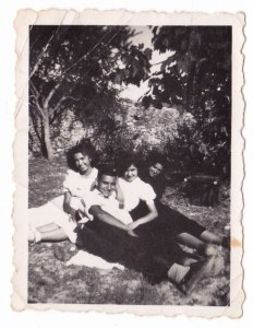 Tres joves molt elegants pugen carretera amunt un diumenge qualsevol. Darrere deixen el poble, a la dreta de la imatge veiem alguns dels grans eucaliptus que donaven la seua ombra; a l’esquerra, l’únic edifici que hi havia a eixa banda de carretera des del llavador. Les xiques, adolescents, són Regina, Marí Piqueras i Lolita Pòlita. Darrere, escrit a mà, posa “Foto Blasco” és a dir Joan de Nela, germà de Maruja Martina; ell i Calo tenien maquinetes de fer fotos.
