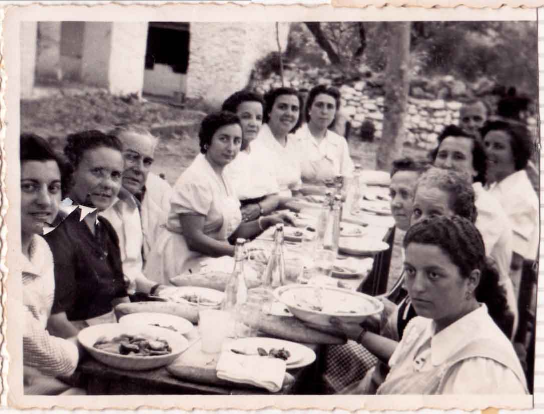La segona és un dinar amb els mestres a l’Ermita: per l’esquerra, reconeixem a Pilarín, a doña Pilar, sa mare, i a don Juan Ros, mestre d’Artana. A continuació Pilar de Ferrero, Doña Claudia, Doña Adoración i la seua germana. A la banda dreta tenim en primer pla a Isabel Gallart i a sa tia, Doña Rosario, i al final a José Nela (Xacola).