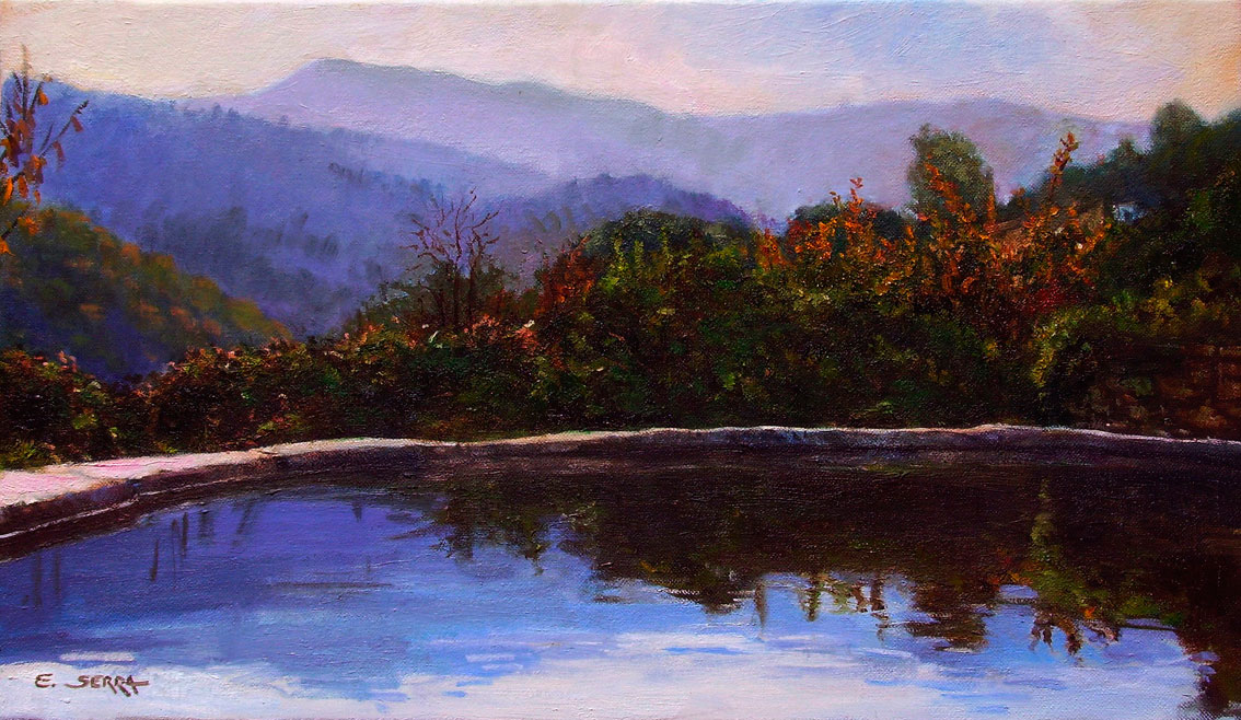 Veo. Bassa de reg. Fosquejant el dia. Oli sobre llenç. 46×27 cm