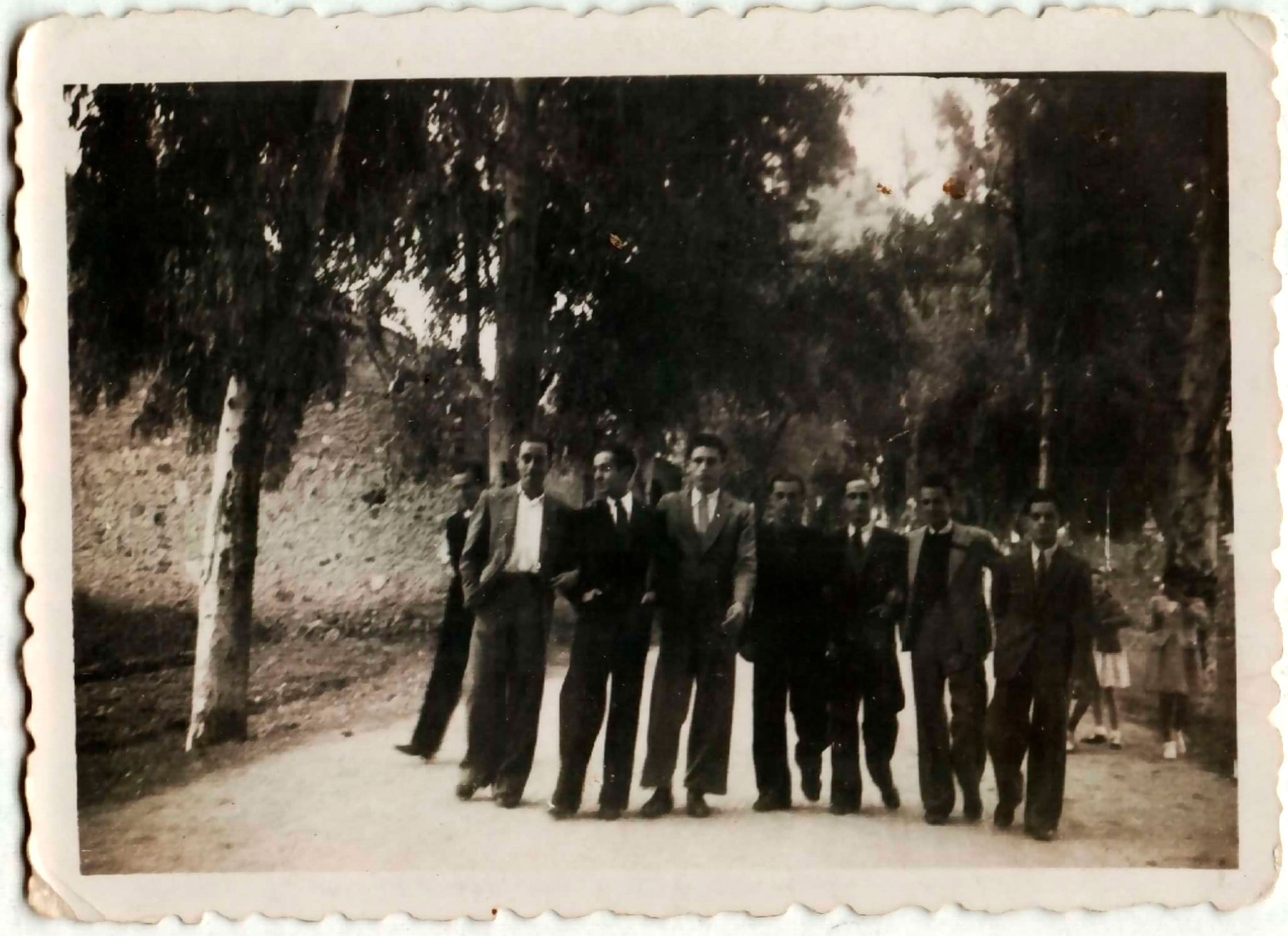 Un grup de joves passejant de bracet per la carretera d’Artana. Durant molts anys, la distracció dels joves era anar carretera amunt i carretera avall, a l’ombra dels grans eucaliptus, on es trobaven els grups de xiques i de xics. S’assentaven als reguerets, la qual cosa era un problema quan alguna xica anava molt mudada (“amb la bata bona”) i no volia seure. Quan es va posar el cine del tio Amplet ja hi havia qui anava al cine i qui anava a la carretera. L’edifici de l’esquerra era el pati dels Planets, estava a prop del llavador, en el seu mateix costat de carretera (això vol dir que el poble el tenien darrere). Probablement la imatge està feta entre 1945 i 1948.