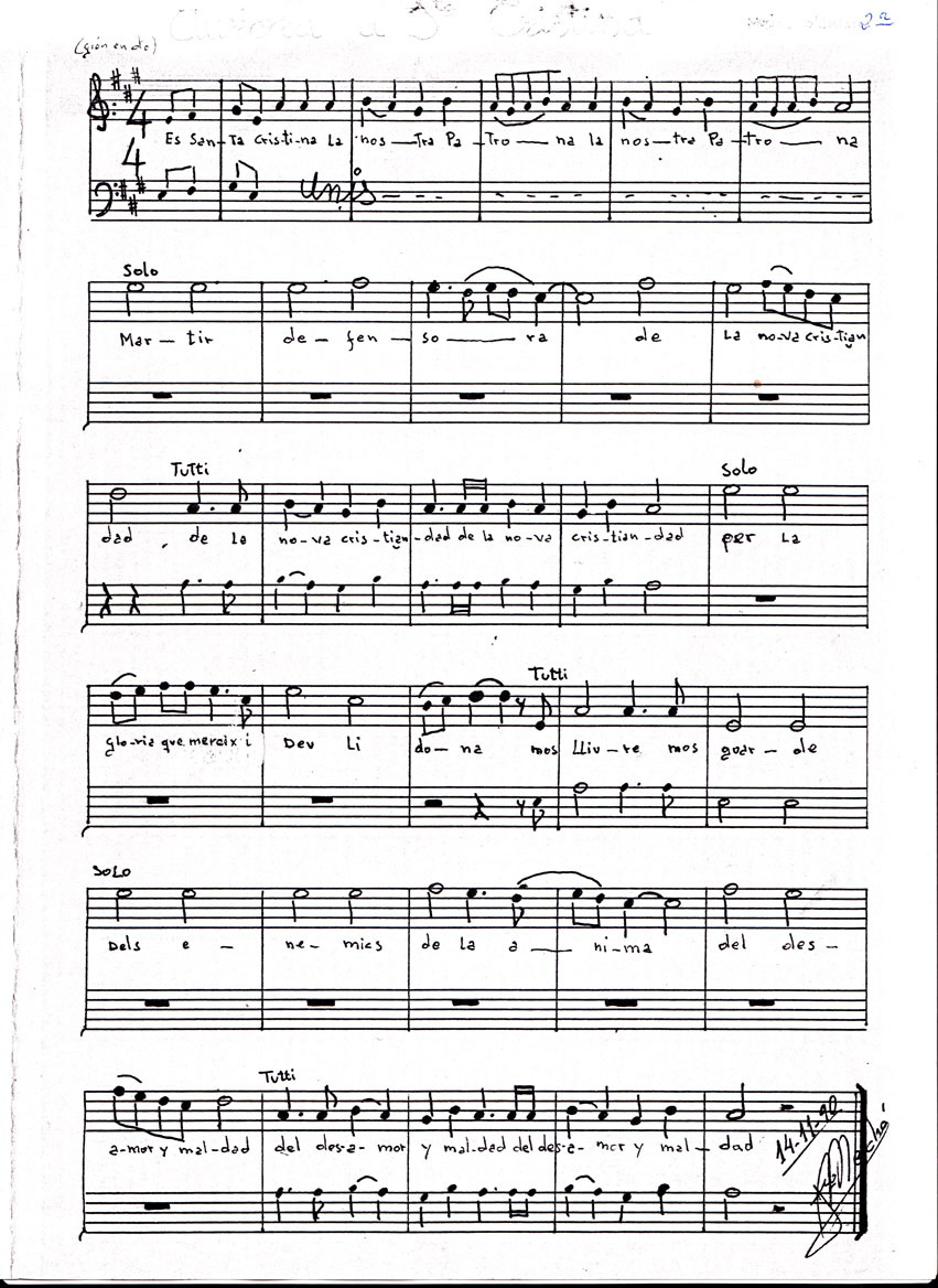 Santa Cristina. “(TOTS) És Santa Cristina/ la nostra patrona/ la nostra patrona./ (SOLO) Màrtir defensora/ de la nova cristiandat/ (TOTS) de la nova cristiandad (bis)/ (SOLO) Per la glòria que mereix/ i Déu li dóna/ (TOTS) mos lliure i mos guarde/ (SOLO) dels enemics de l’ànima/ del desamor i maldat/ (TOTS) del desamor i maldat (bis)”